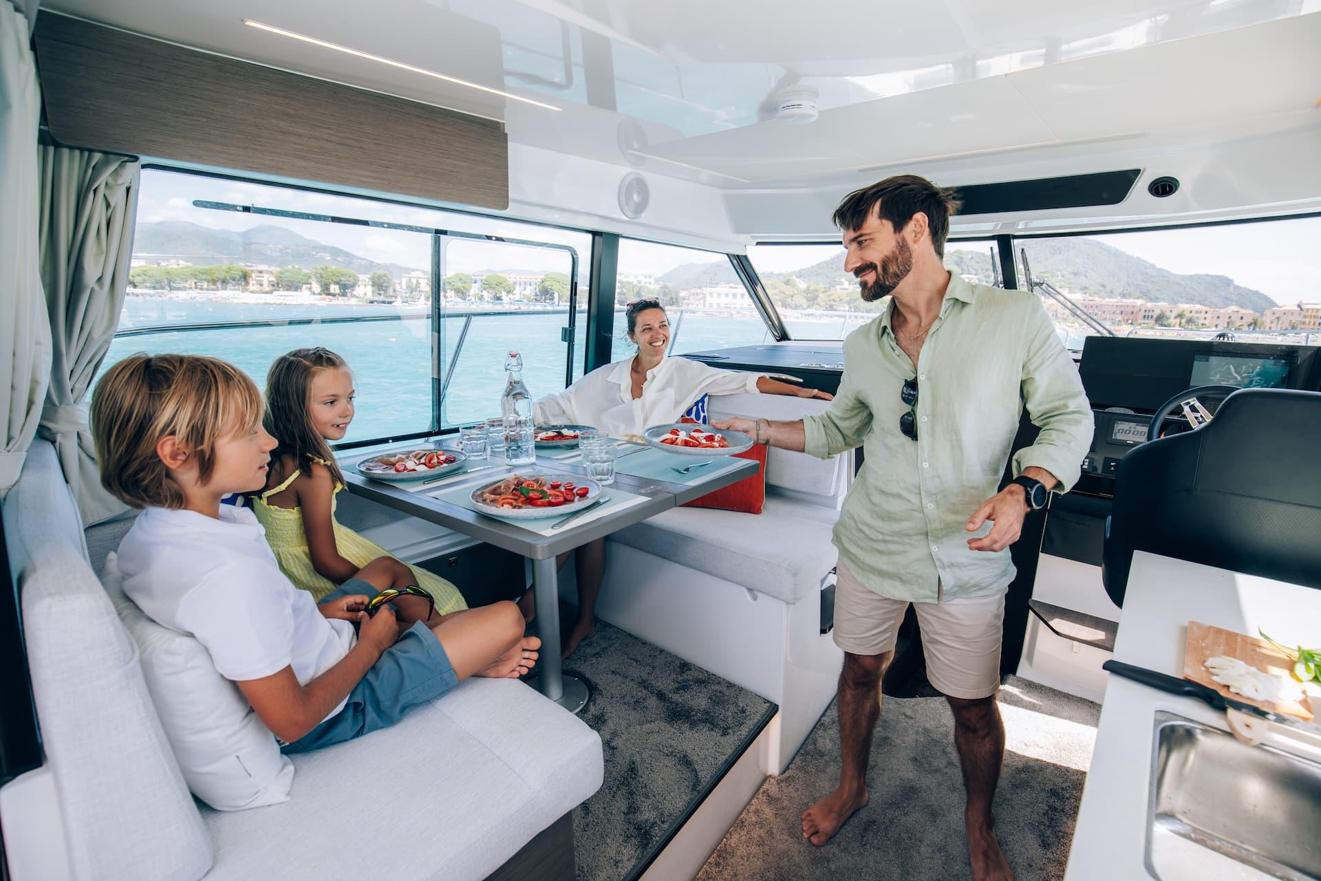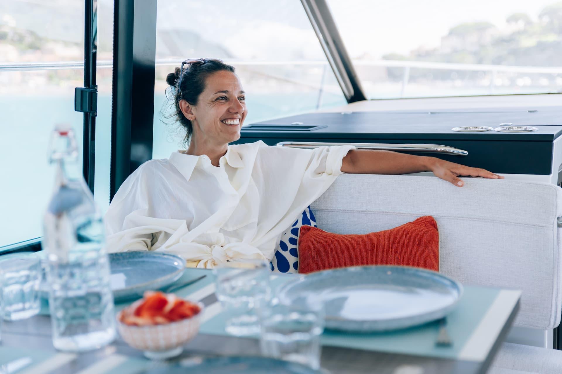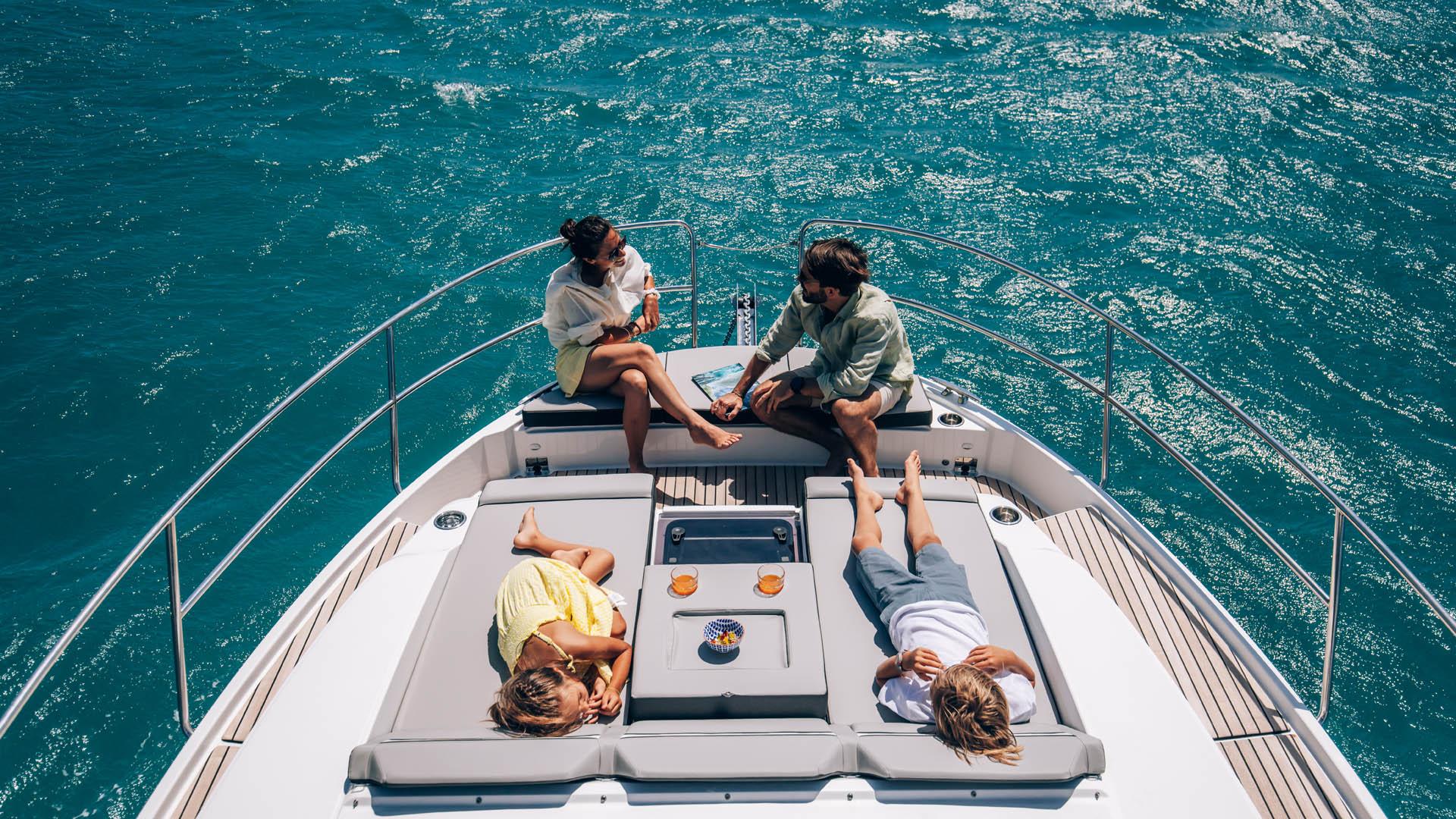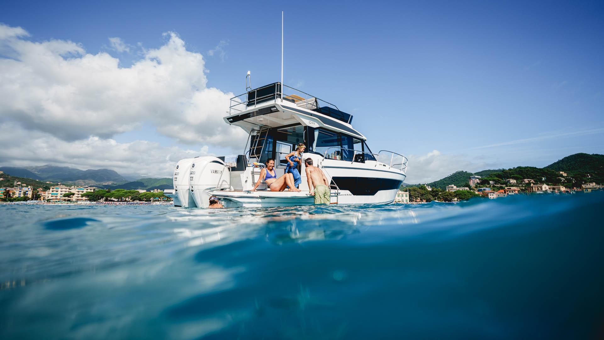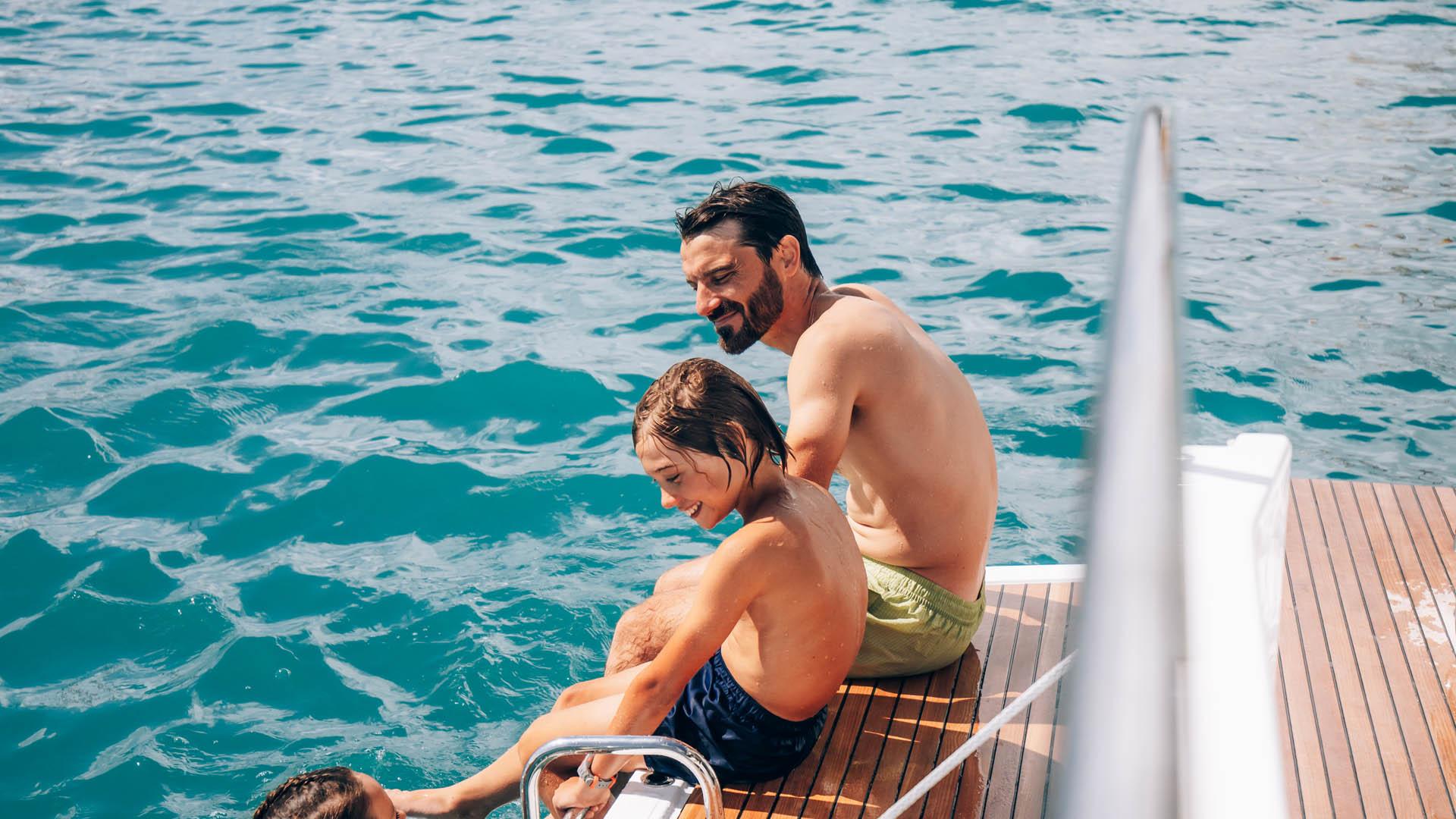 Aft, a large, 1.75-metre terrace can be deployed at anchor, creating a spacious platform on the water, providing access for swimming with family and friends.