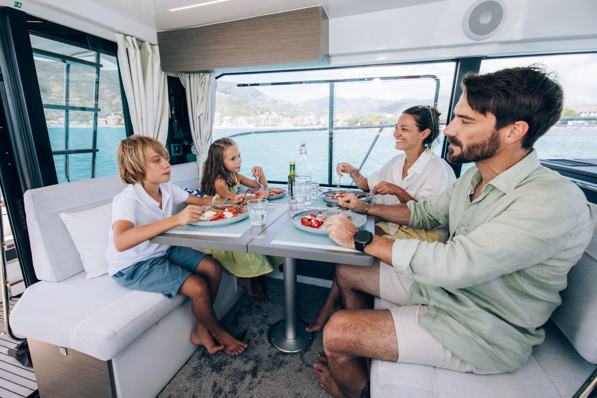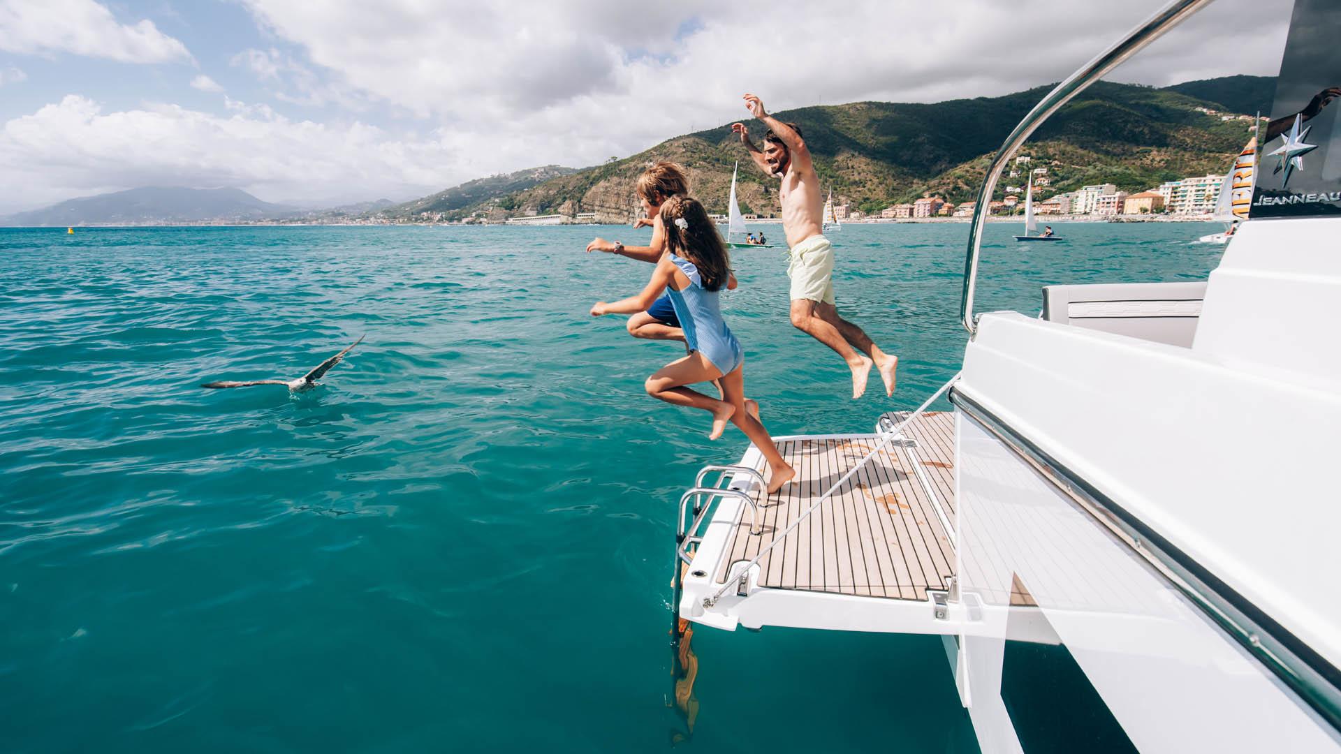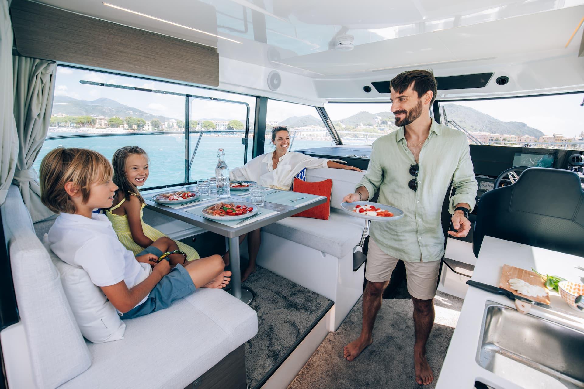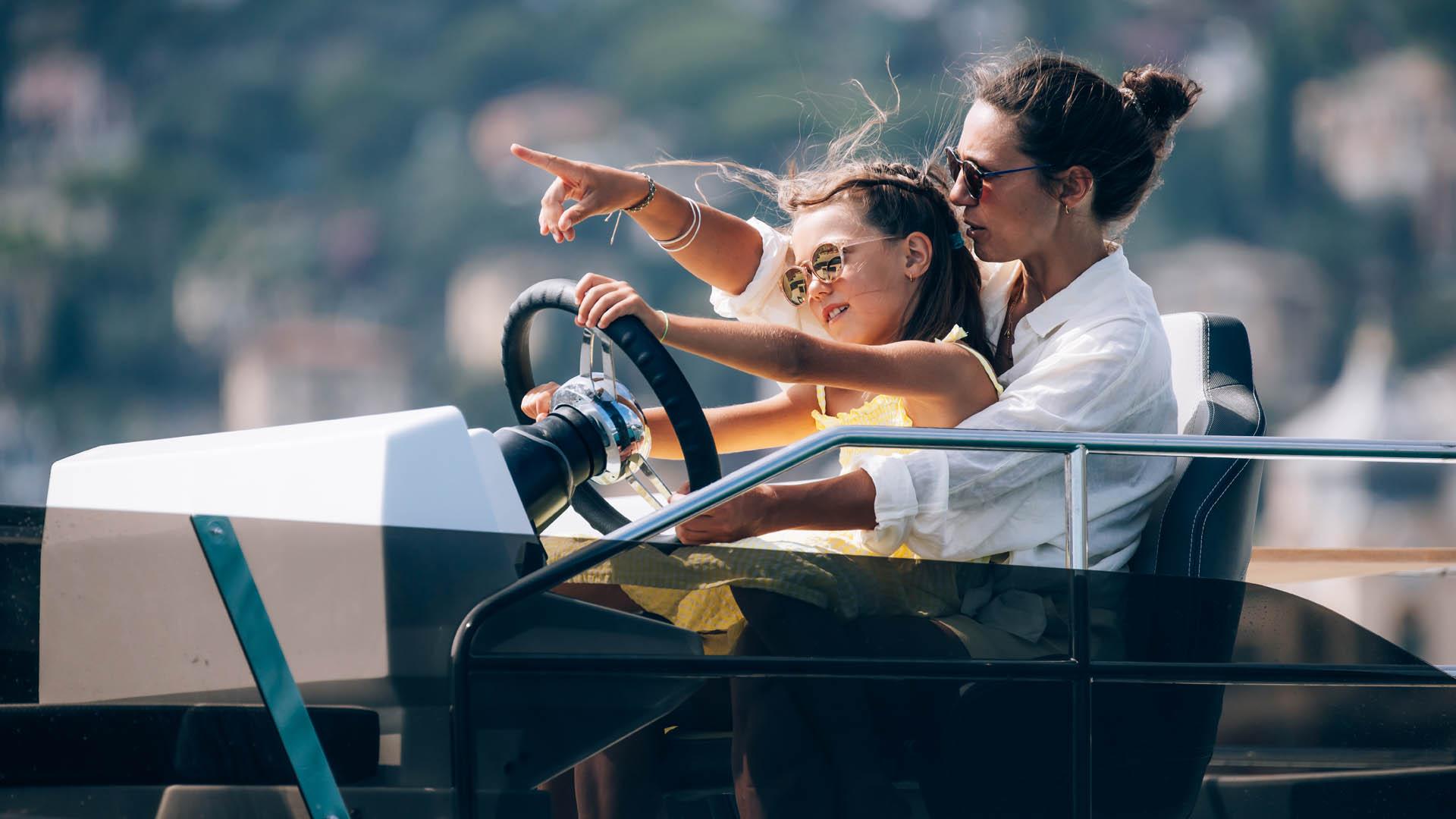 Aft, a large, 1.75-metre terrace can be deployed at anchor, creating a spacious platform on the water, providing access for swimming with family and friends.