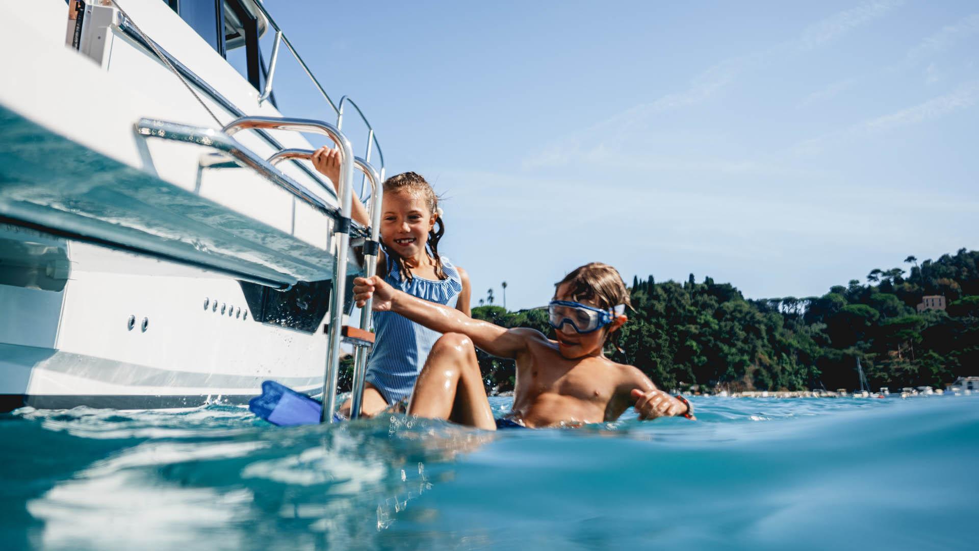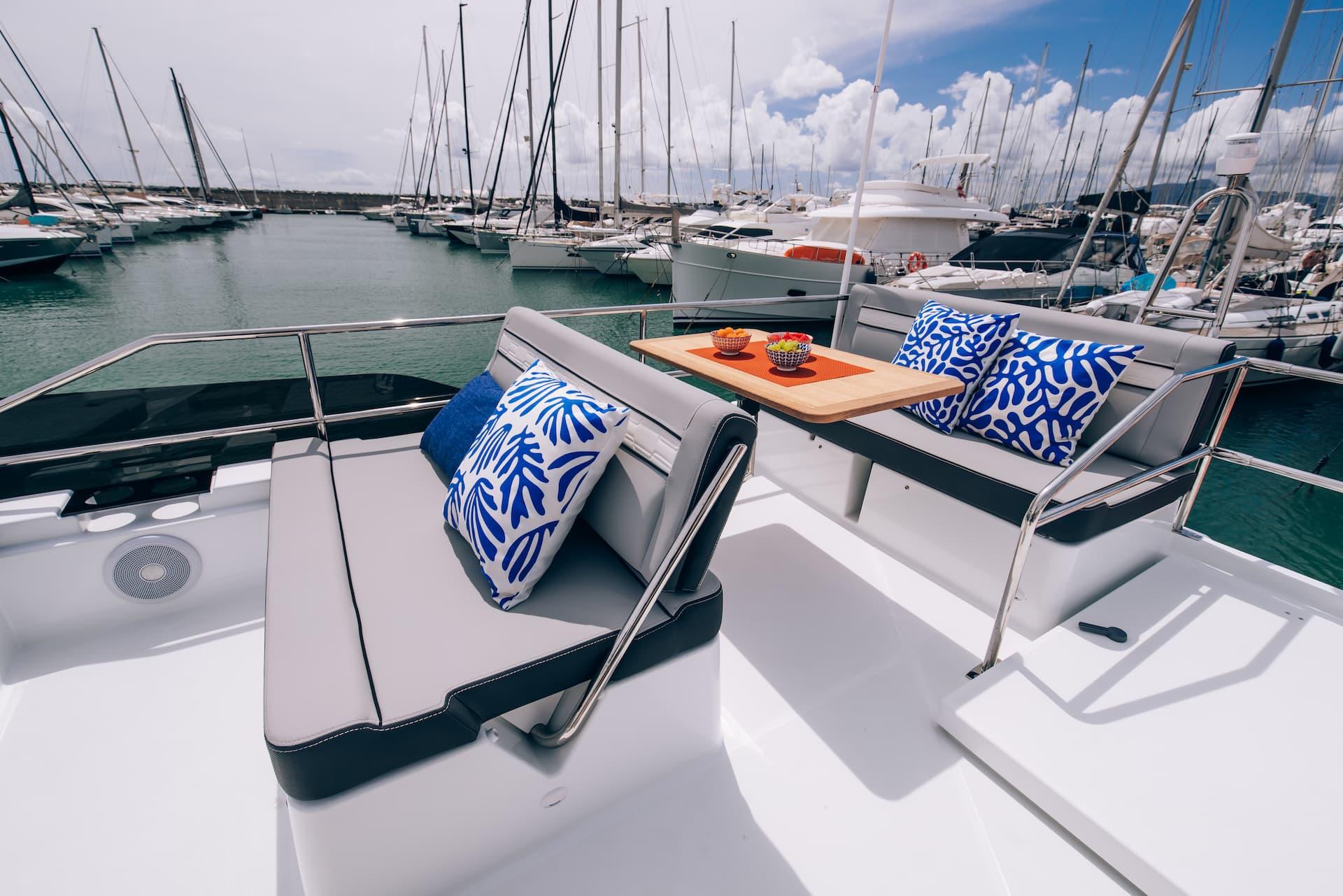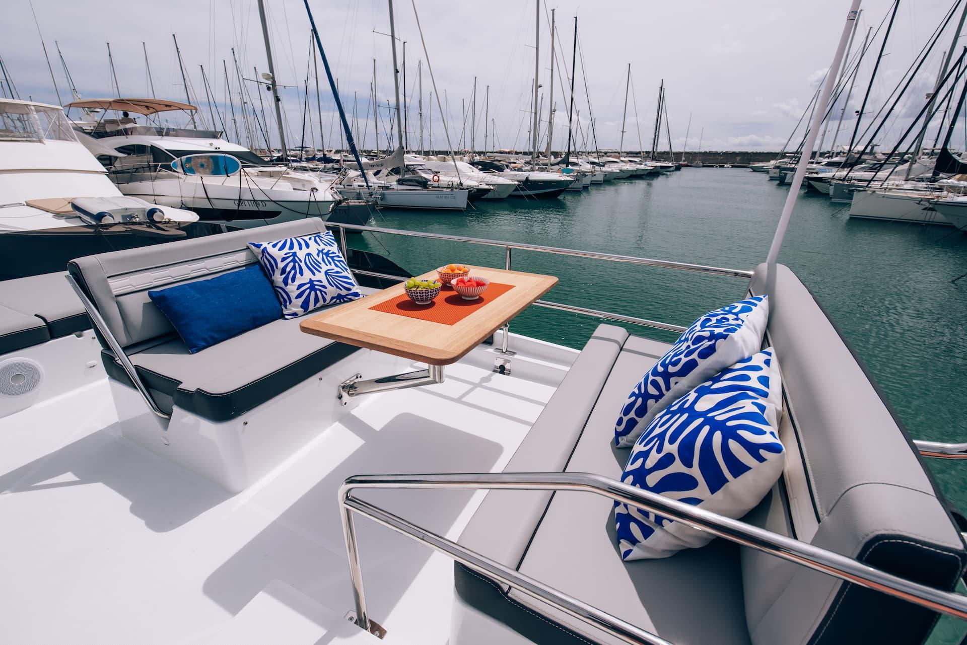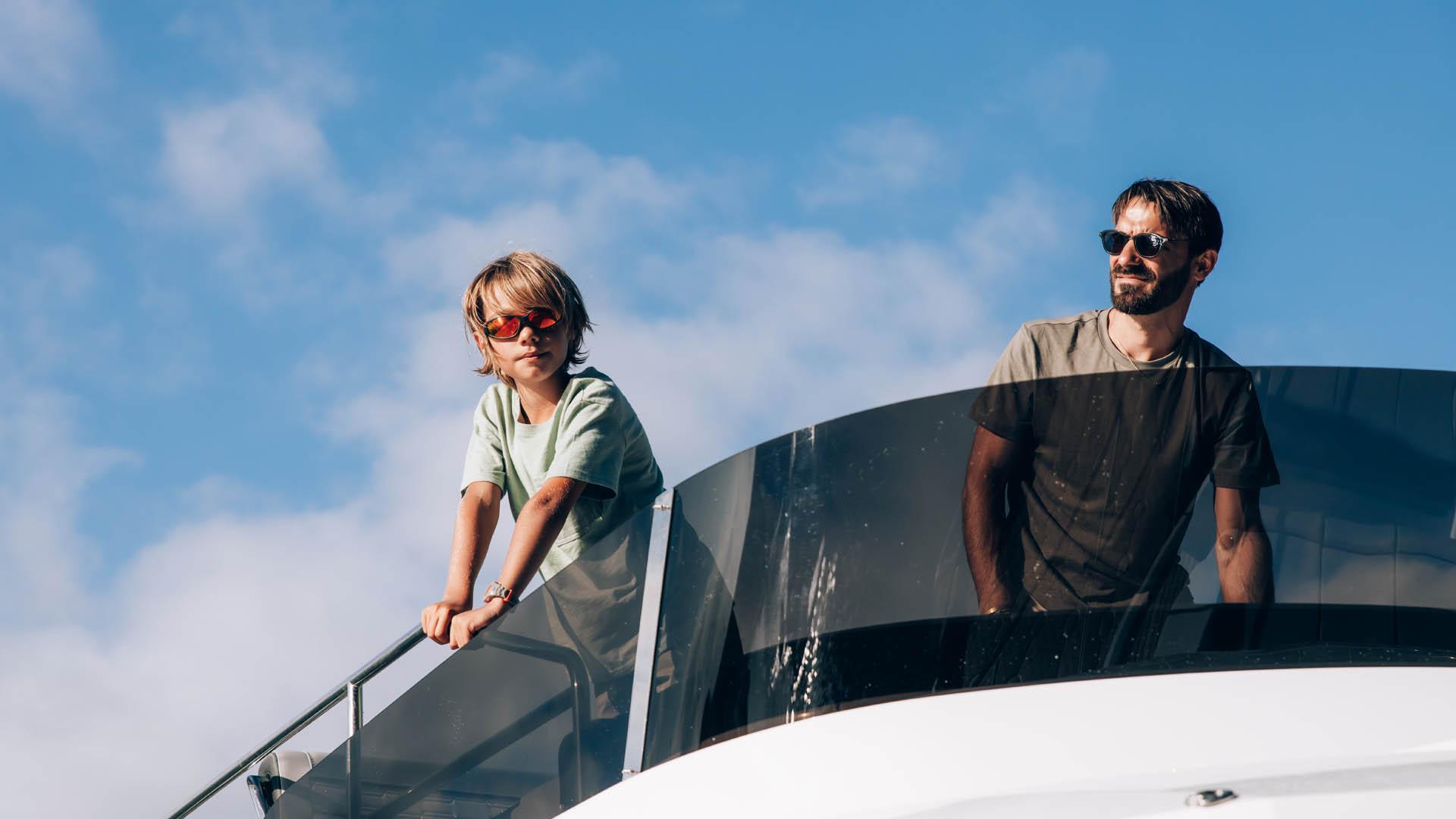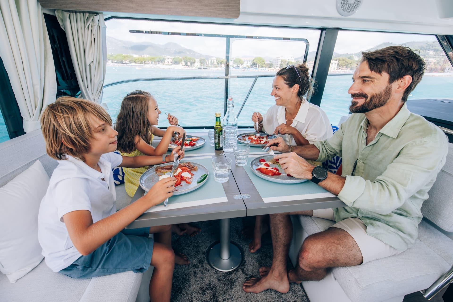 Aft, a large, 1.75-metre terrace can be deployed at anchor, creating a spacious platform on the water, providing access for swimming with family and friends.