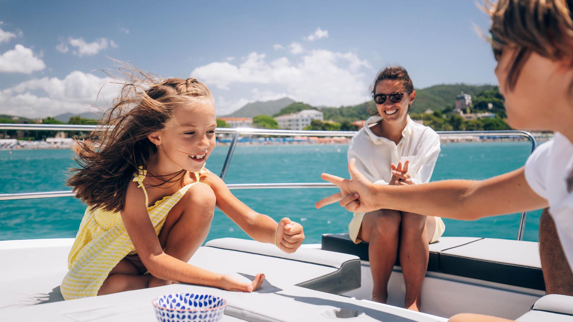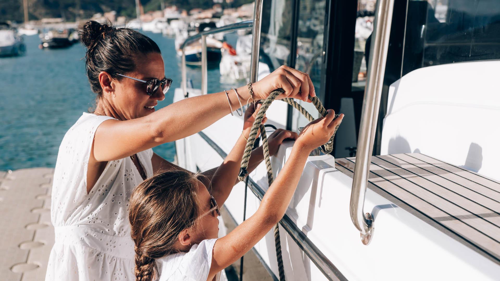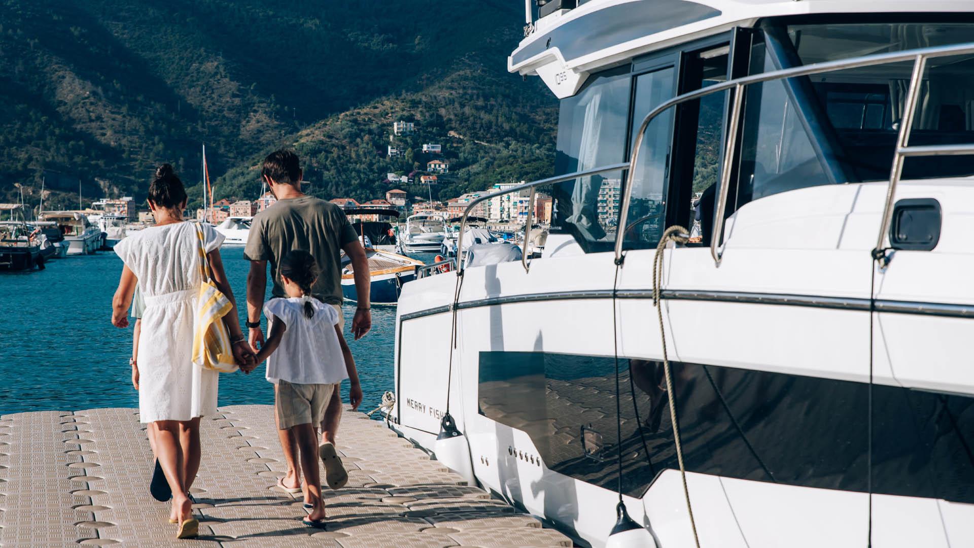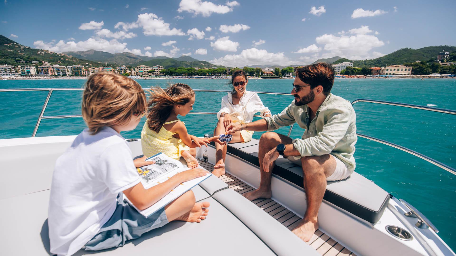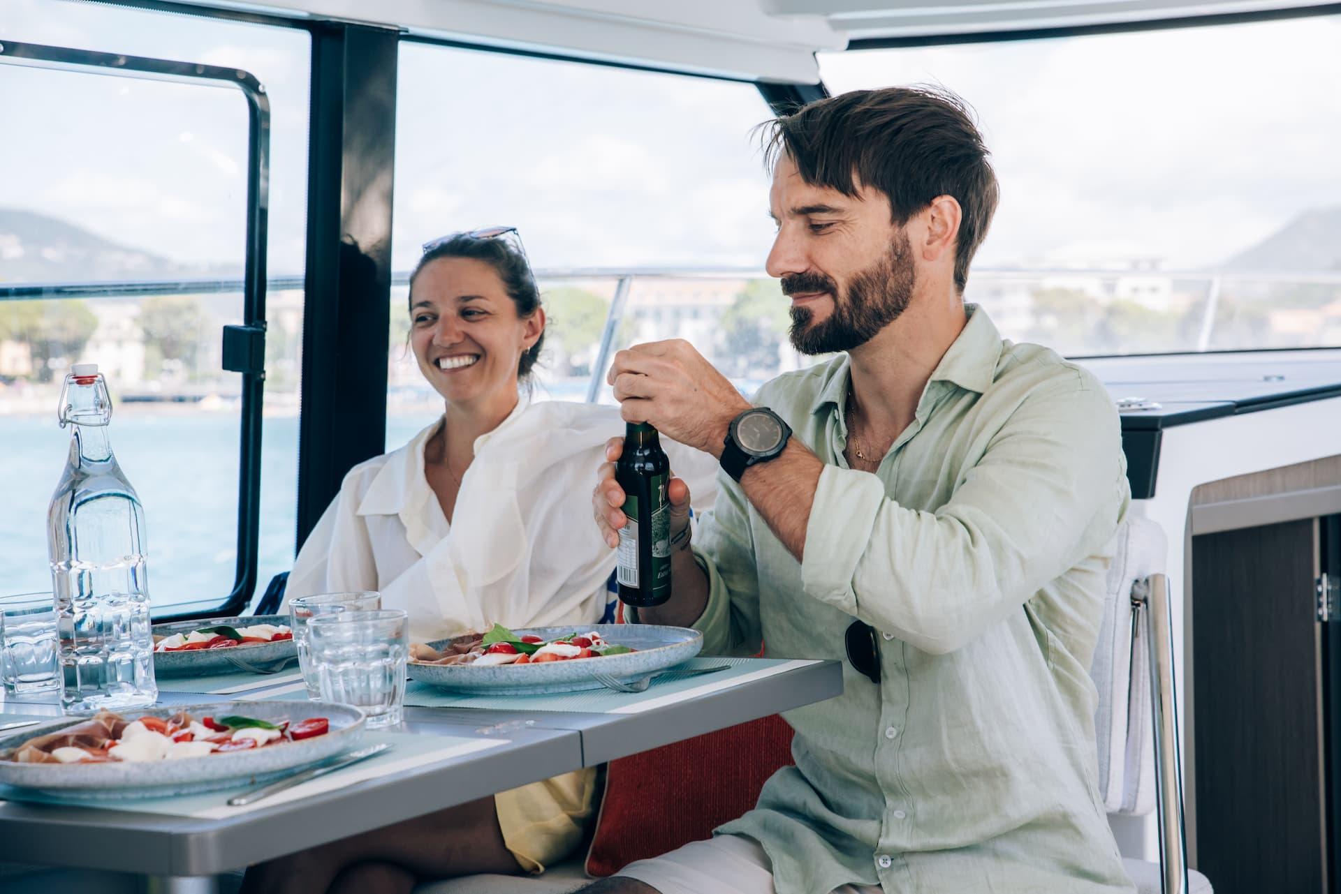 Aft, a large, 1.75-metre terrace can be deployed at anchor, creating a spacious platform on the water, providing access for swimming with family and friends.