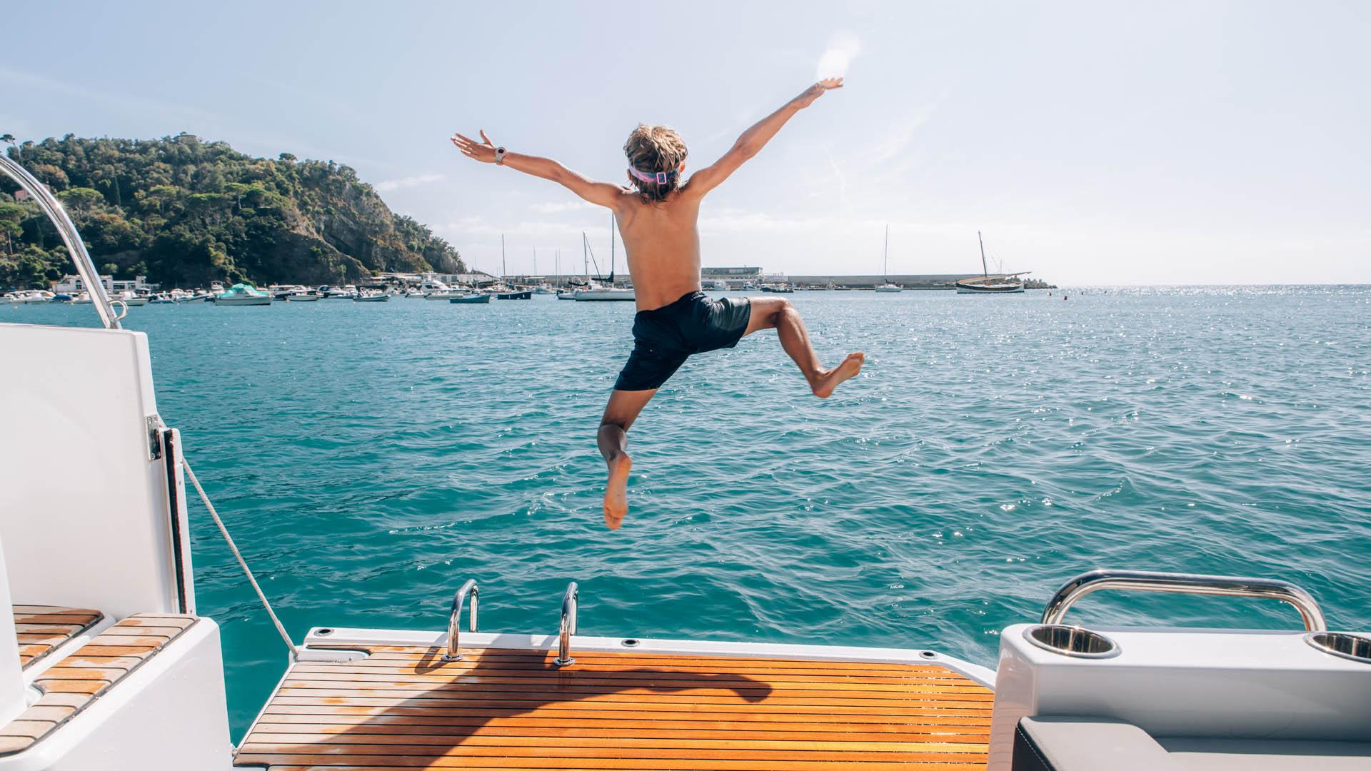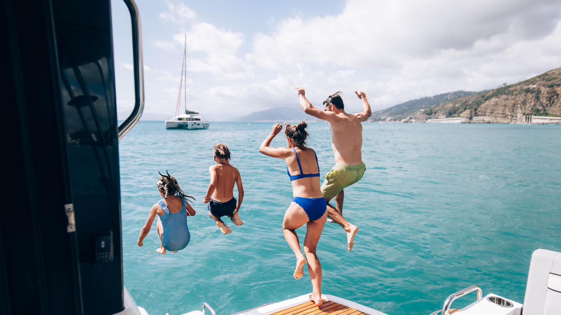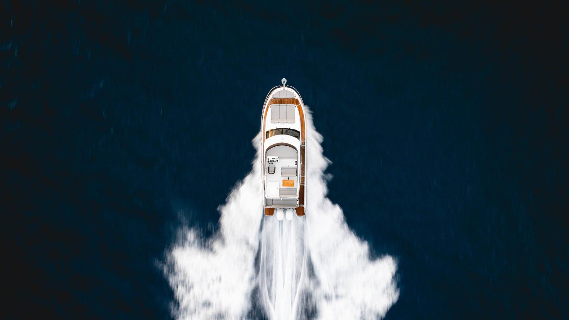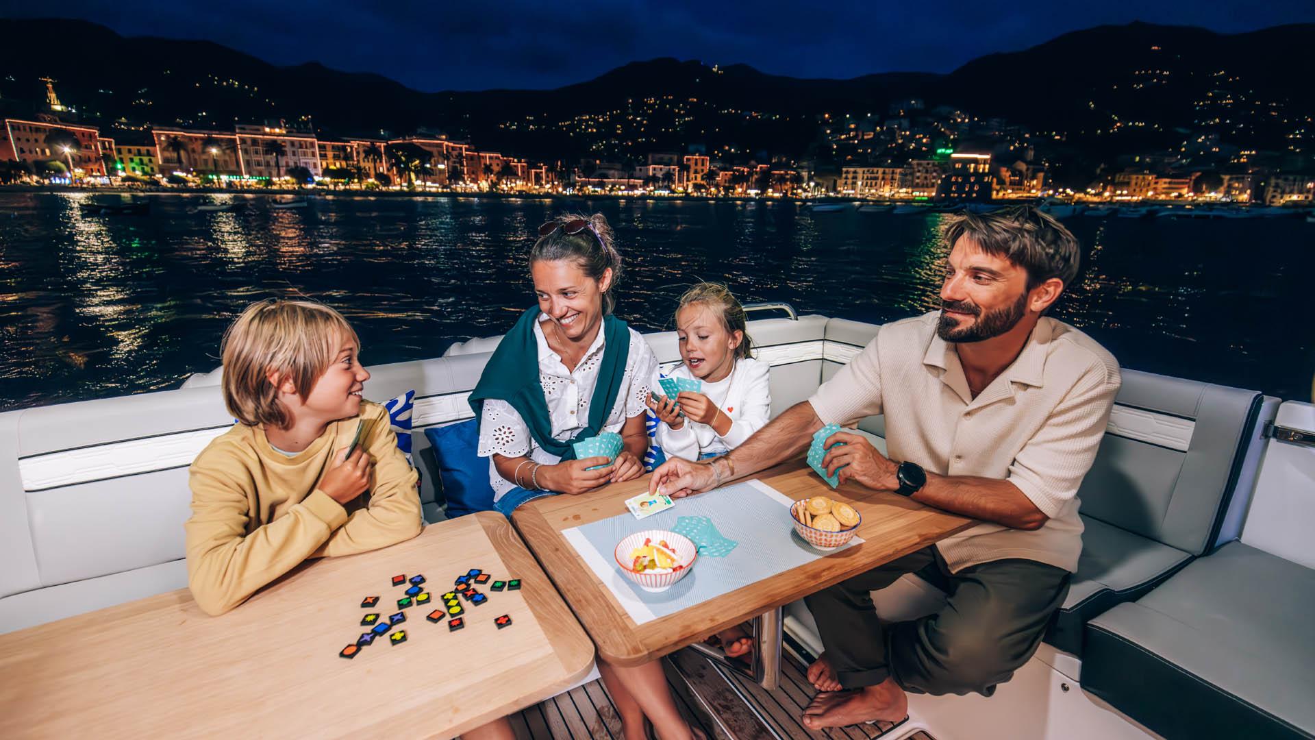 Aft, a large, 1.75-metre terrace can be deployed at anchor, creating a spacious platform on the water, providing access for swimming with family and friends.