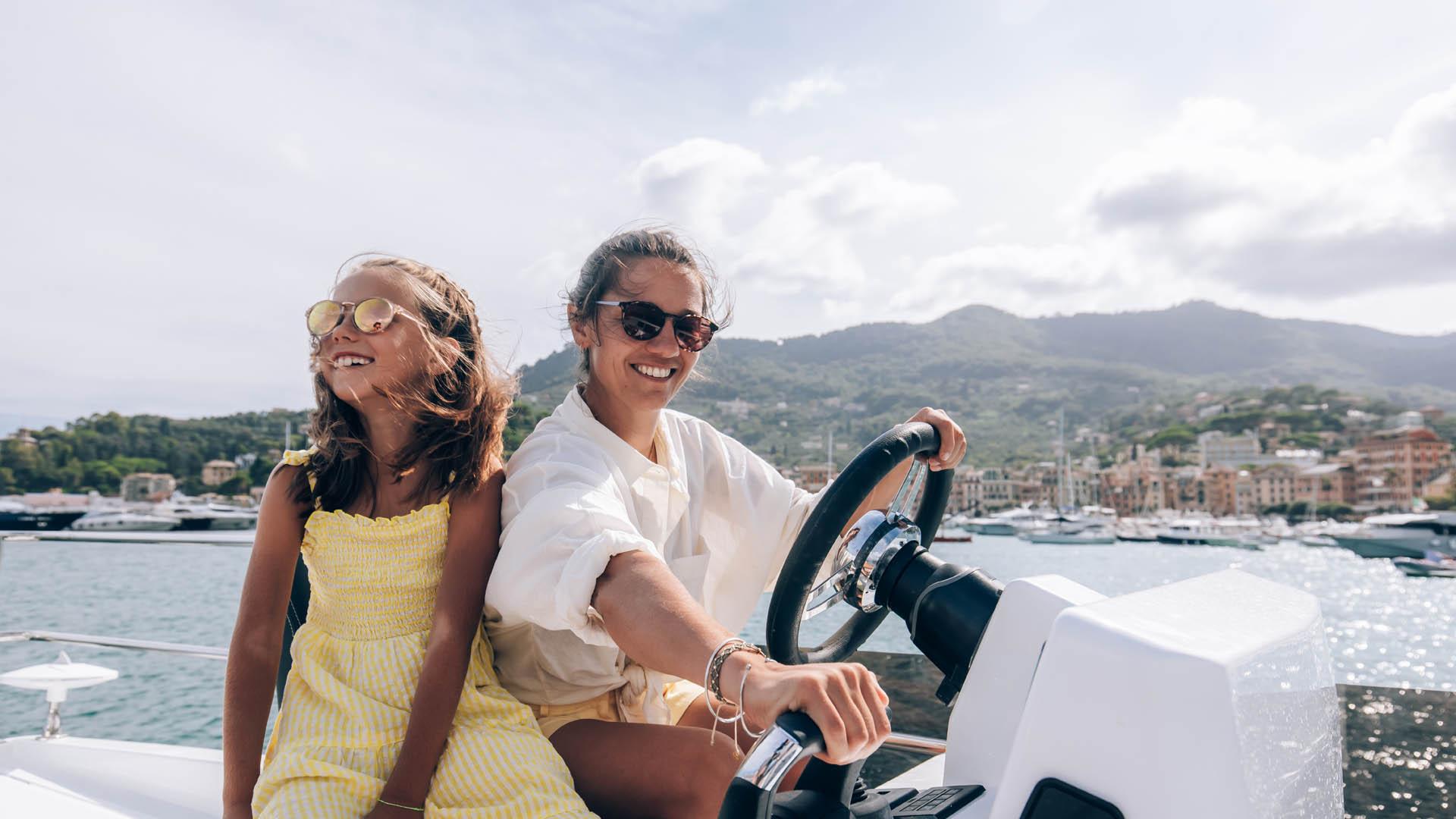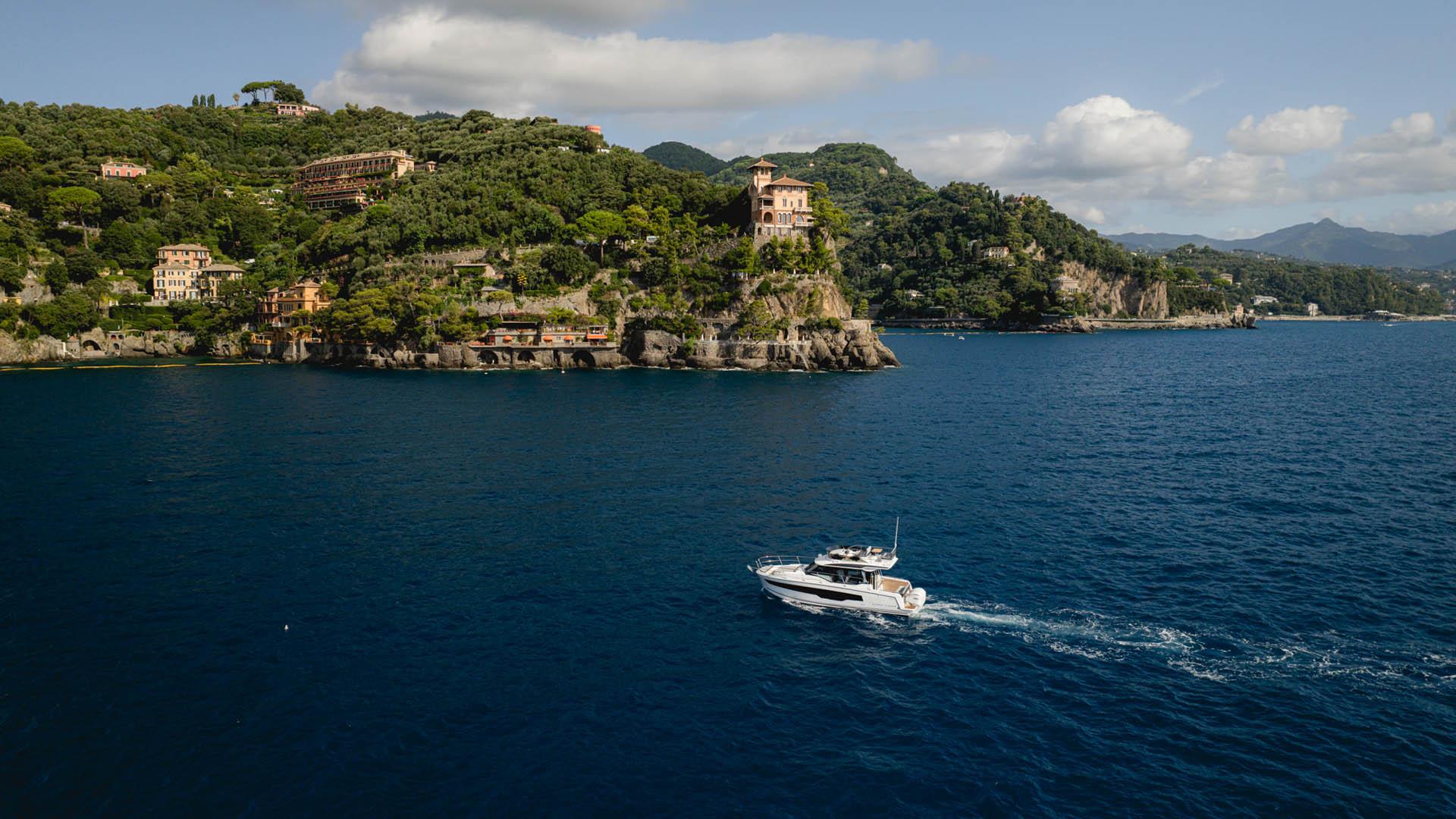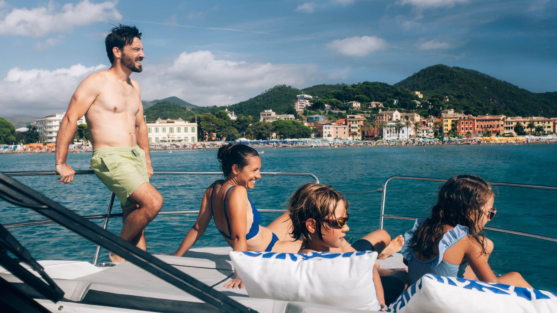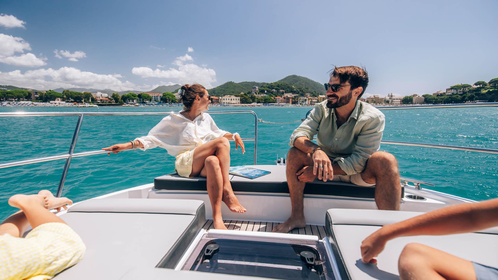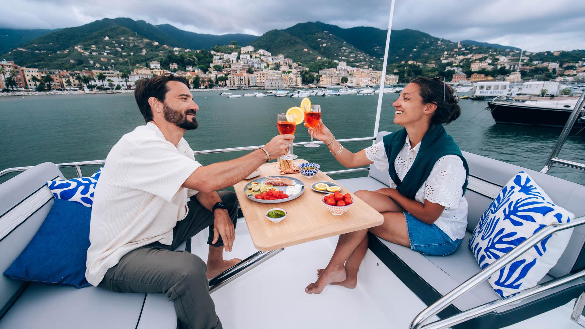 Aft, a large, 1.75-metre terrace can be deployed at anchor, creating a spacious platform on the water, providing access for swimming with family and friends.