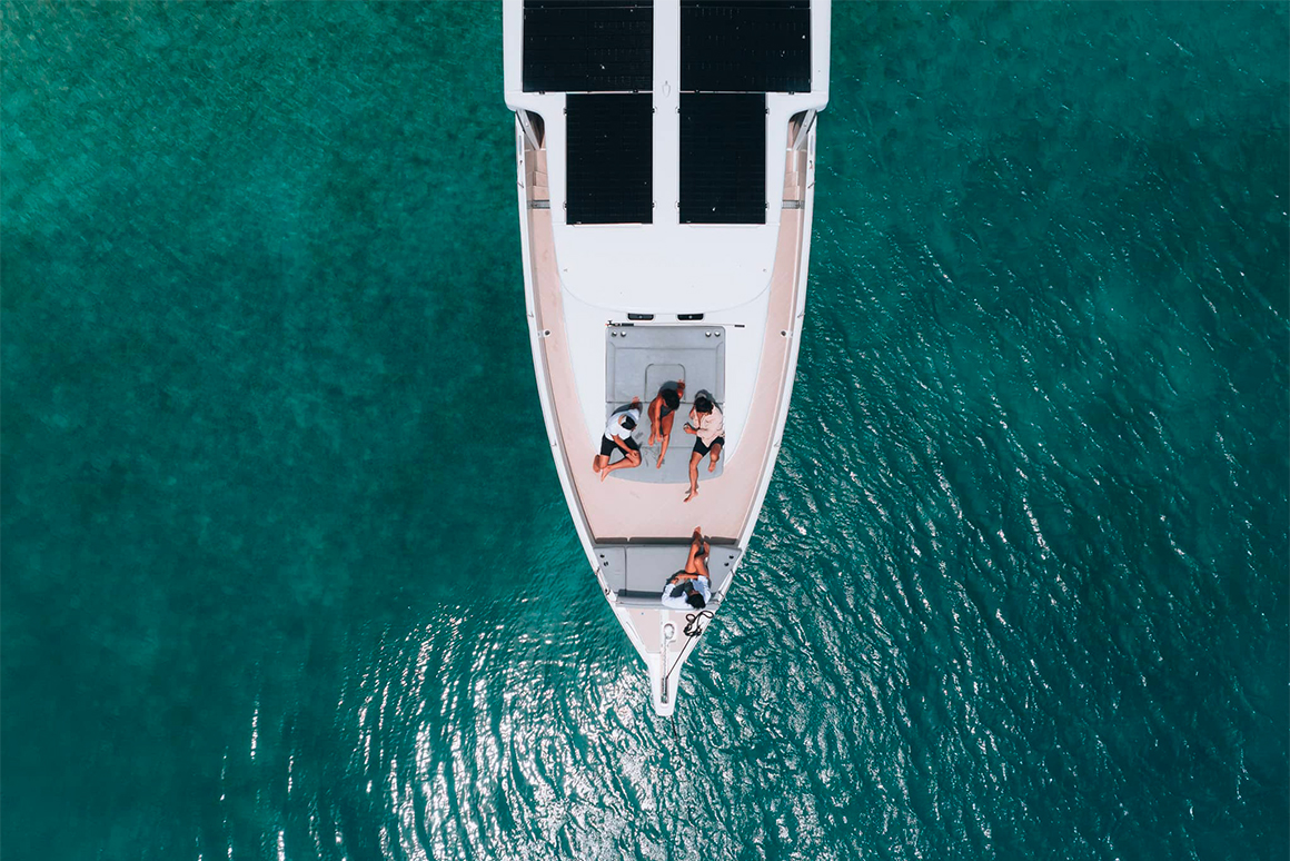 Zur Minimierung des ökologischen Fußabdrucks wird die Energie von einer 30-kWh-Lithium-Ionen-Batterie geliefert, die teilweise von 4,2-kW-Solarkollektoren auf dem Dach des Bootes aufgeladen wird.. Das System deckt 30 bis 50 % des Energiebedarfs an Bord ab und ermöglicht es der Besatzung, bis zu fünf Tage lang völlig unabhängig und ohne Generator vor Anker zu liegen. Das automatisierte Energiemanagement ermöglicht es allen, abzuschalten und wirklich zu entschleunigen.