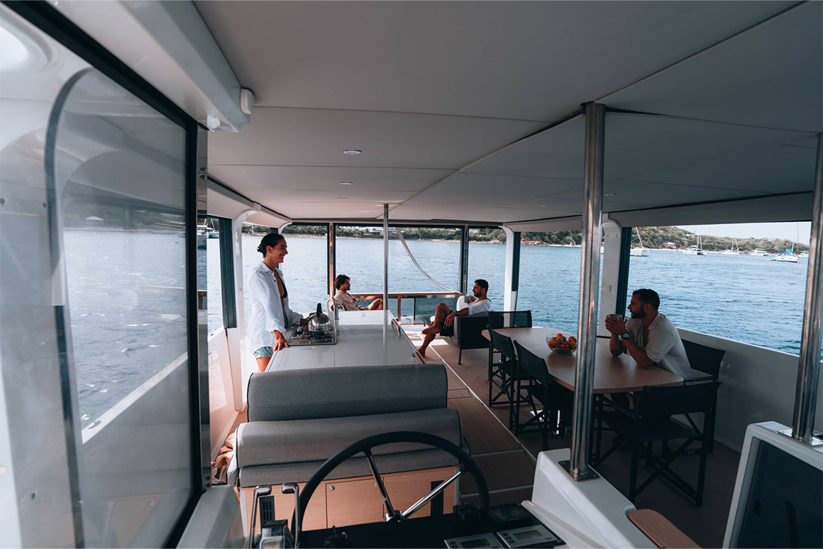 Der Innensalon der Sea Loft 480 stellt einen großen, besonders einladenden Wohnraum mit Panoramablick dar. Die Pantry, das Herzstück des Raumes, ist ein Ort der Geselligkeit - wie zu Hause. Im Außenbereich befindet sich am Bug des Schiffes eine großzügige Sonnenterrasse, die sich ideal zum Lesen, Diskutieren oder einfach nur zum Betrachten der Umgebung eignet. Im Heck schließlich befindet sich eine modulare Terrasse, die es den Gästen an Bord ermöglicht, den Wohnraum beim Ankern zu vergrößern, um den schönsten aller Pools optimal zu nutzen: das Meer um das Boot herum...