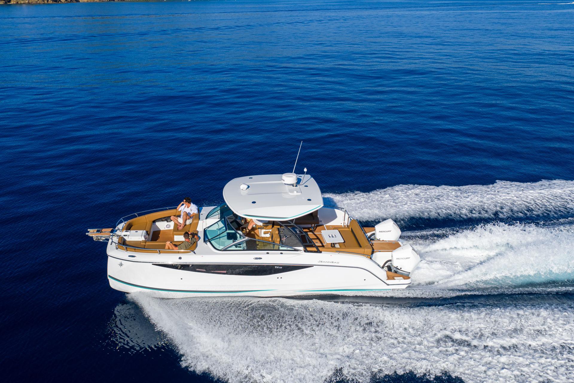 The TH33 offers vast exterior living spaces conducive to interacting and relaxing. Her ergonomic helm station, boasting wide, comfortable forward seats, ensures a safe, natural driving position. Onboard technology, including two 12-inch Garmin multifunction display screens and a 7-inch passenger-side screen, facilitates handling and reinforces confidence. The integrated windscreen and optional hard top provide effective shelter from the wind and natural elements for peaceful cruising throughout the year.